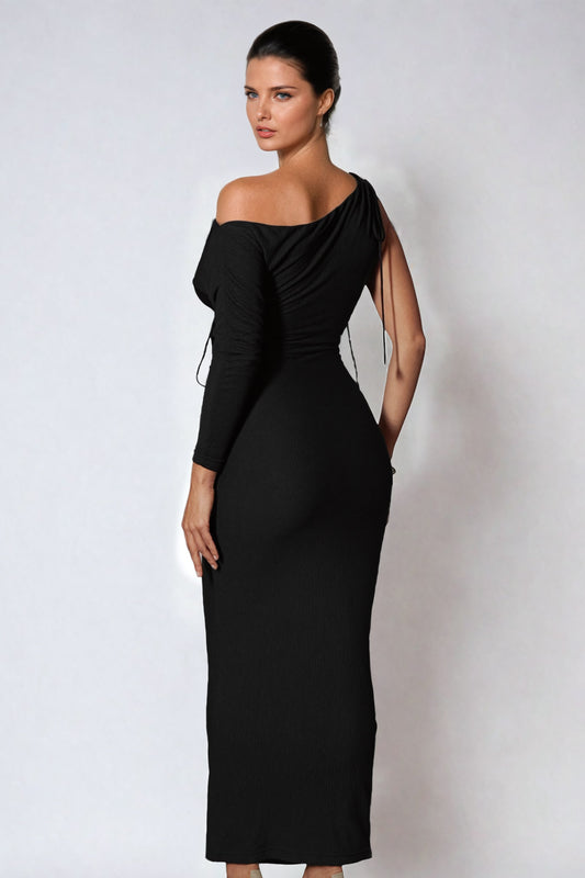 Off-Shoulder Ruched Maxi Dress with Strap Accent - Black