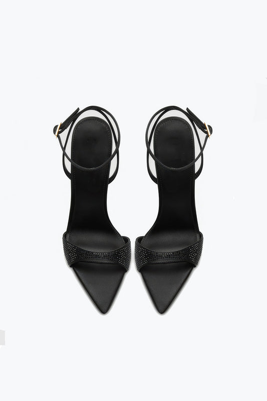 Stiletto Heel Sandals with Spiral Rhinestone Straps - Black