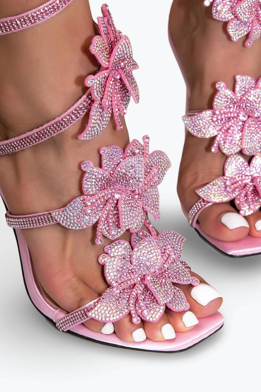 High Heel Sandals with Rhinestone Flower Front Detail - Pink