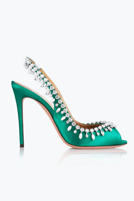 Slingback Heels with Crystal Trim and Open Toe - Green