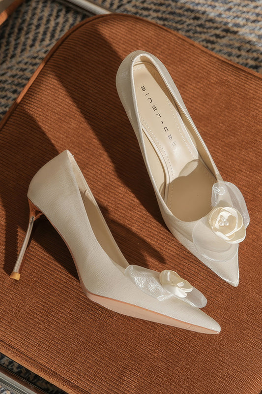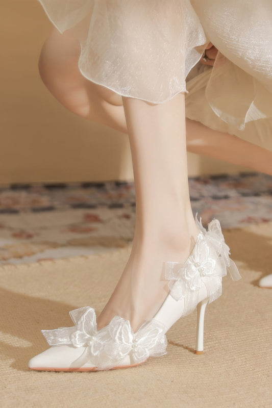 Pointed Heels with 3D Lace Flowers and Satin Bows - White