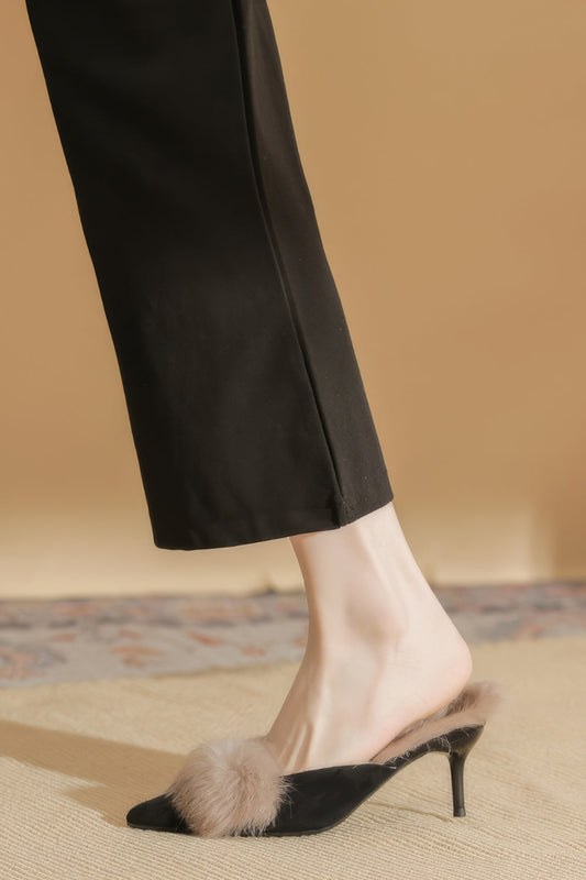 Pointed Mules with Fur Trim and Kitten Heel - Black