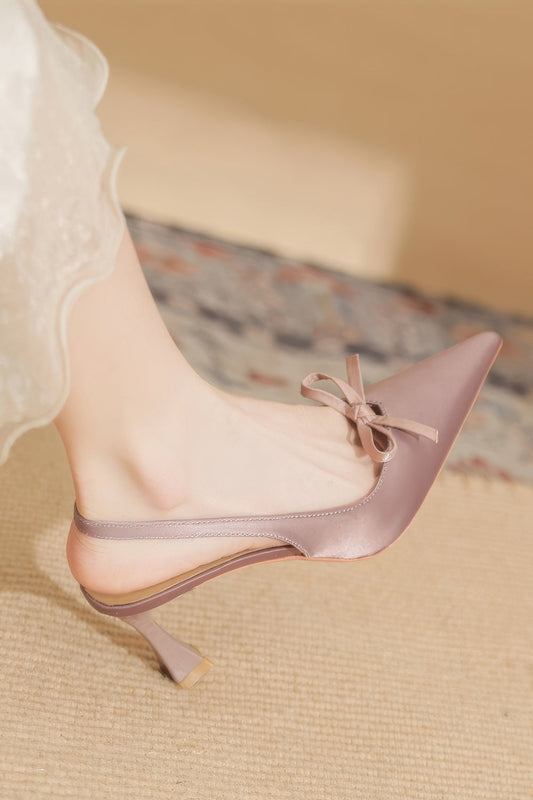 Pointed Slingback Heels with Bow Detail and Flared Heel - Pink
