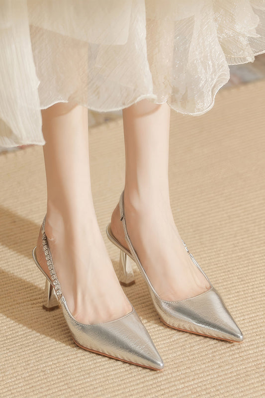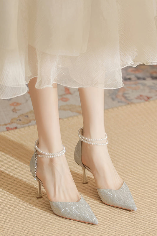 Pointed Toe Glitter Heels with Double Pearl Straps - Silver