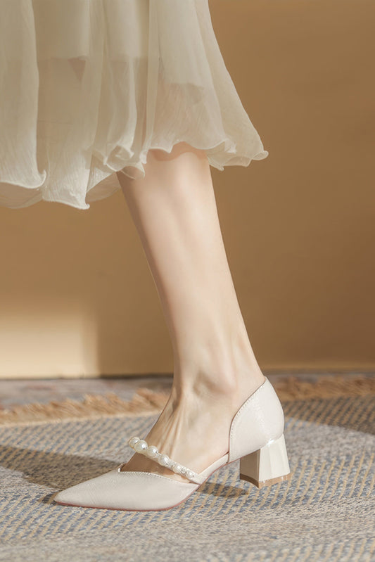 Pointed Toe Shoes with Pearl Strap and Block Heel - Satin White