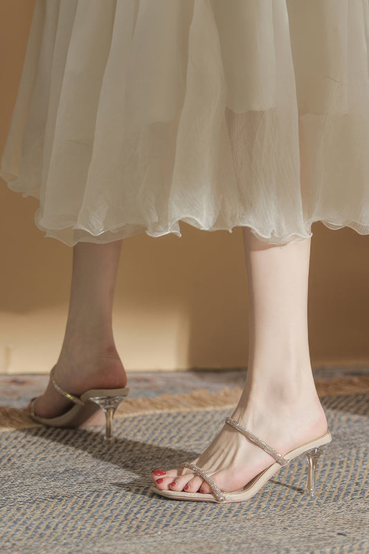 Open Toe Heels with Thin Double Straps and Clear Heel - Beige