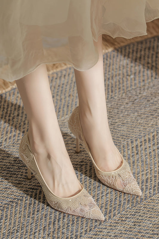 Pointed Toe Heels with Sheer Lace Design - Cream