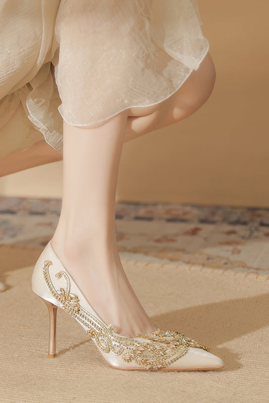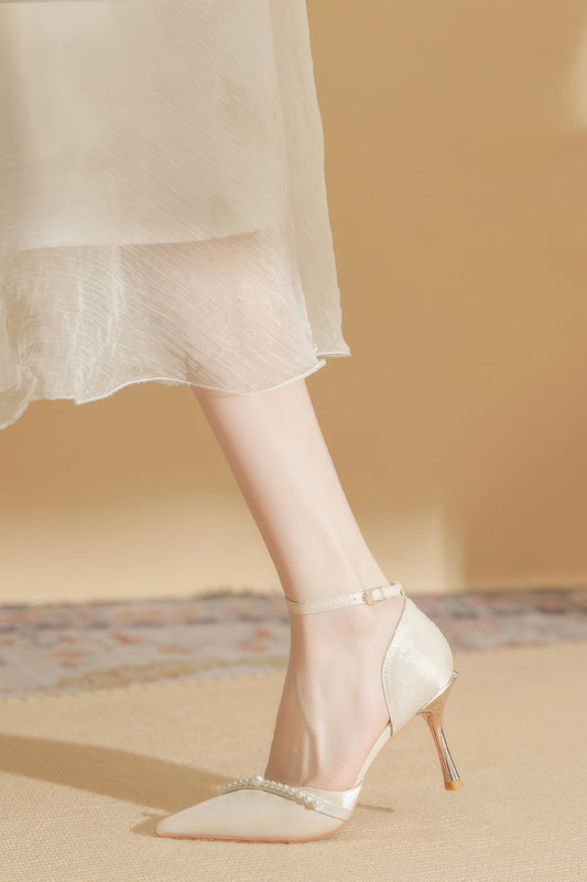 Pointed Toe Heels with Pearl Strap and Ankle Buckle - Apricot