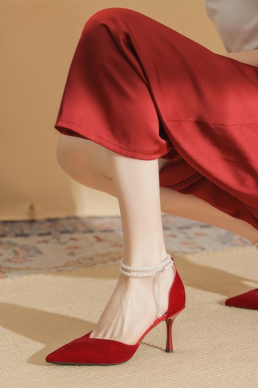 Pointed Toe Heels with Layered Pearl Ankle Straps and Charm - Red