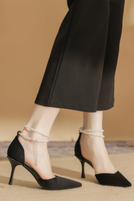 Pointed Toe Heels with Layered Pearl Ankle Straps and Charm - Black