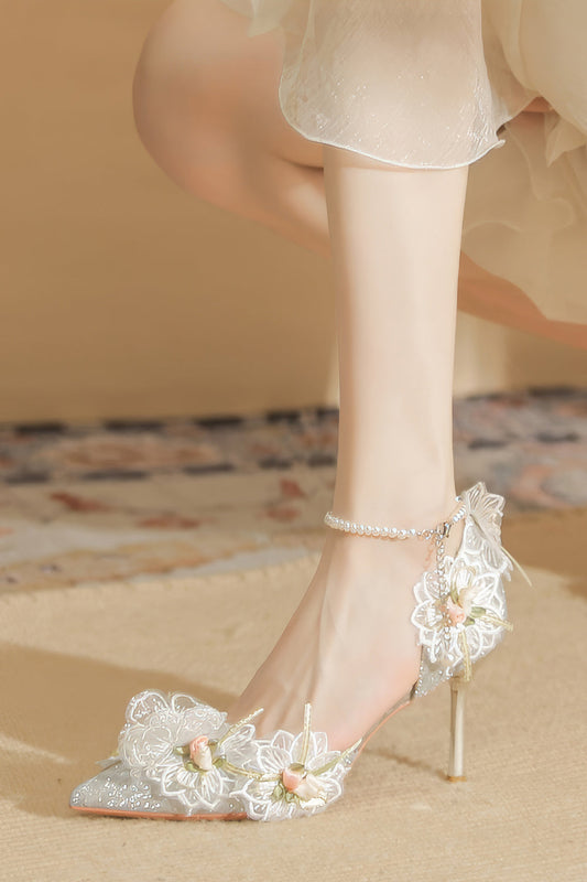 Pointed Toe Heels with 3D Floral and Pearl Ankle Straps - Silver