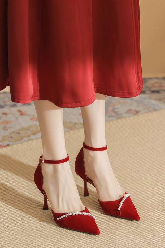 Pointed Toe Heels with Pearl Strap and Ankle Buckle - Red