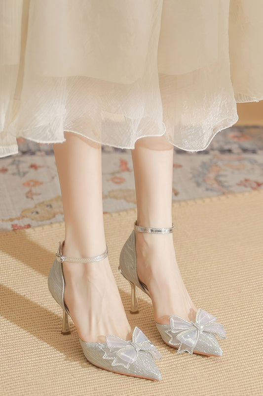 Glitter Heels with Large Bow and Ankle Strap - Silver