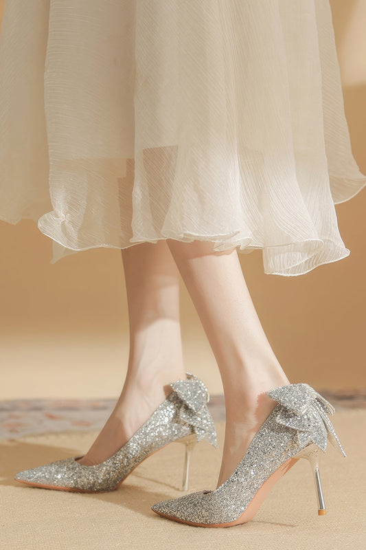 Pointed Toe Heels with Glitter and Large Back Bow - Silver