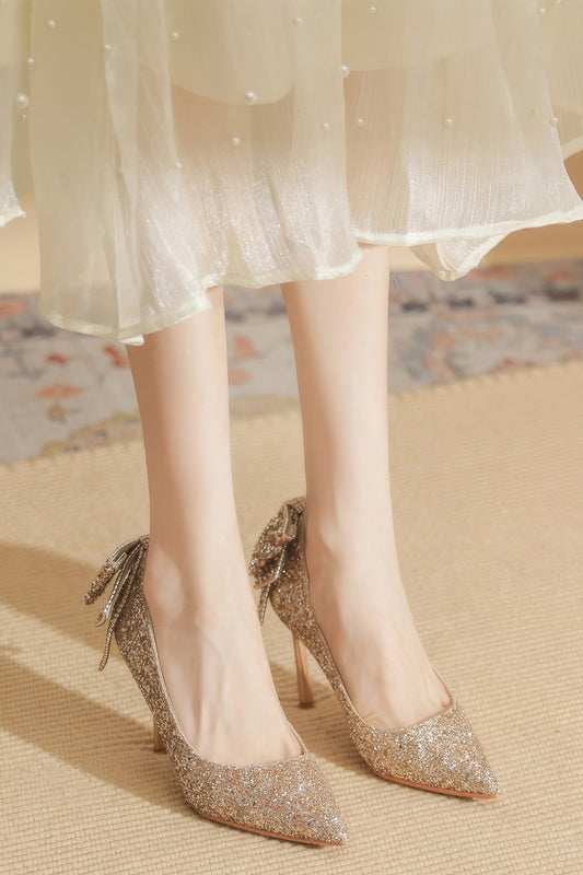 Pointed Toe Heels with Glitter and Large Back Bow - Gold