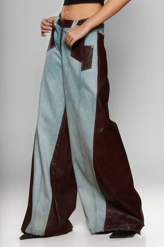 Wide-Leg Denim Jeans with Leather Panels - Brown