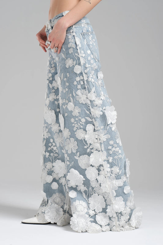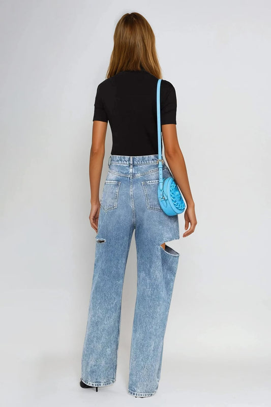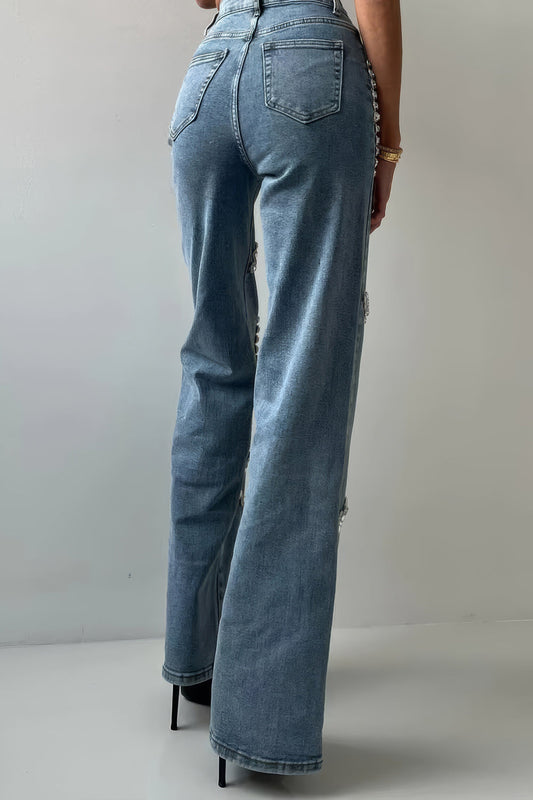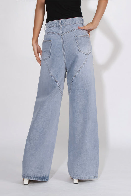 Wide Leg Denim Pants with Beaded Cut-Out - Blue