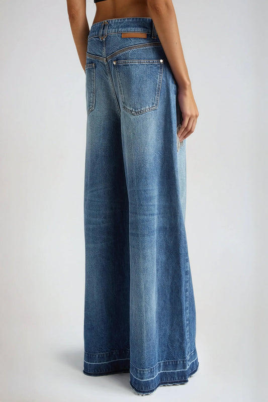 Wide-Leg Jeans with Fringe Bead Accents - Blue