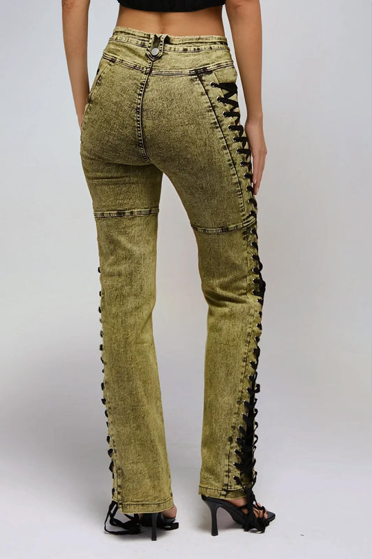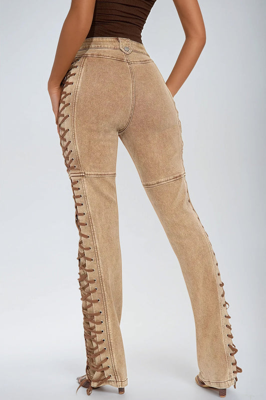 Lace-Up Straight-Leg Jeans with Flared Cuffs - Blue