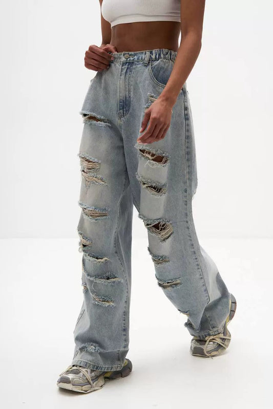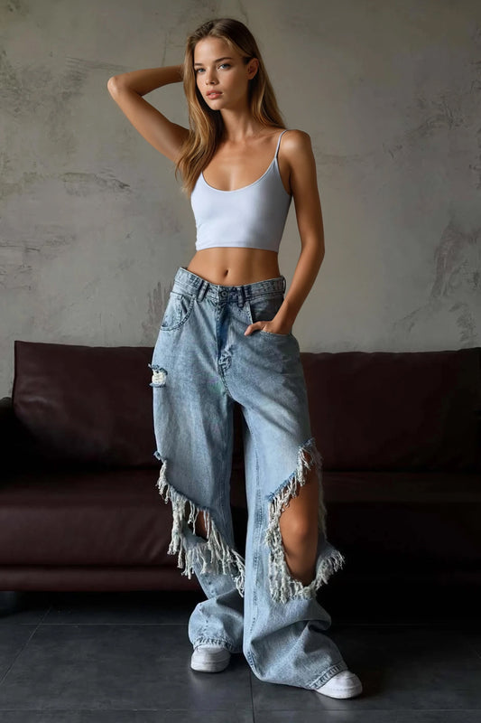 Distressed Wide Leg Jeans with Fringe Cut-Outs - Blue