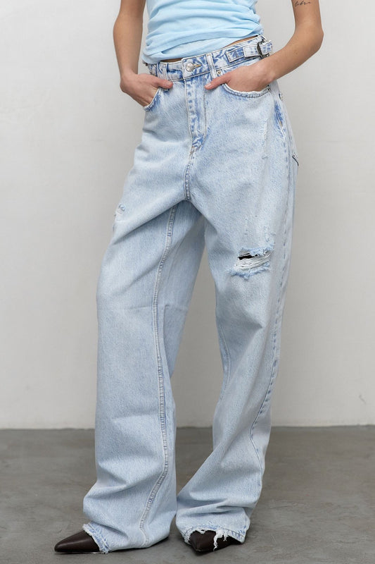 High-Waisted Cut-Out Detail Baggy Jeans with Belted Waistband - Blue
