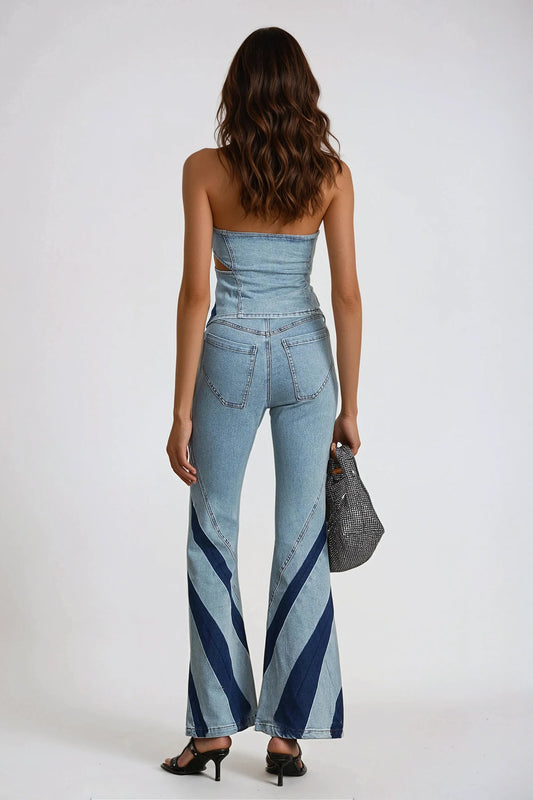 Two-Piece Set with Denim Strapless Top and Flared Pants - Blue