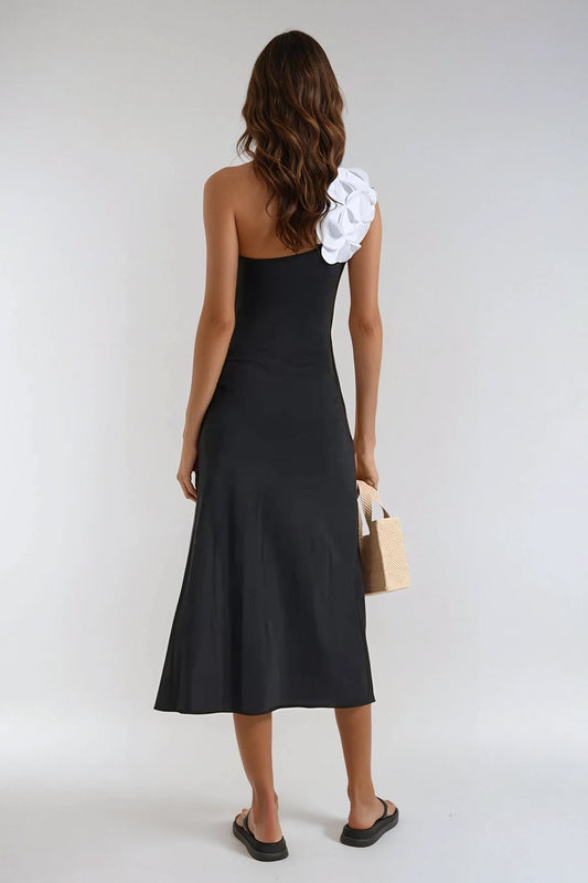 Two-Piece Set with One-Shoulder Bodysuit and Midi Skirt - Black
