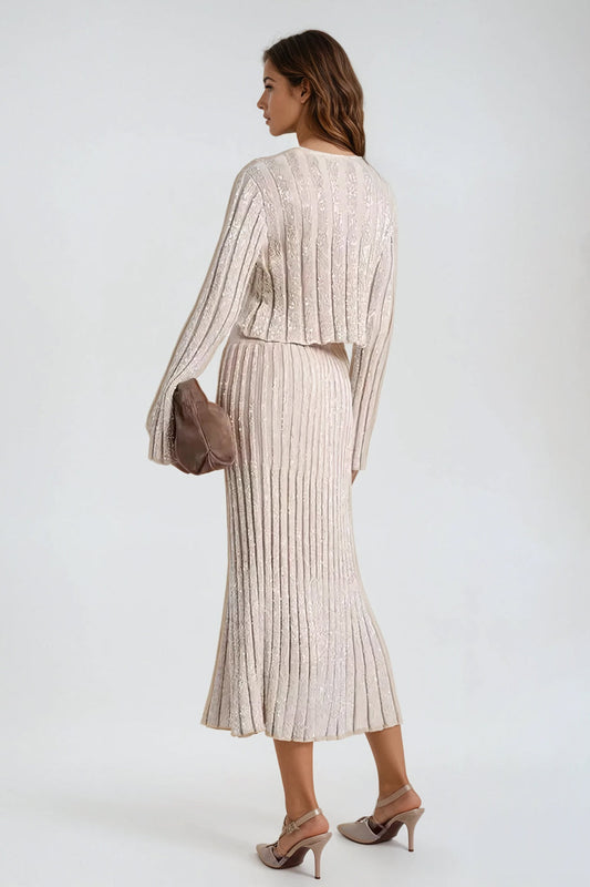 Two-Piece Set with Long Sleeve Knitted Top and Pleated Maxi Skirt - Beige