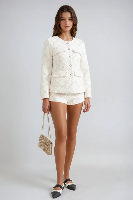 Two-Piece Set with Textured Jacket and Shorts - White