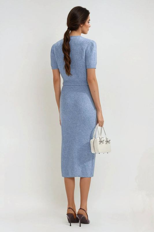 Two-Piece Knitted Set with Buttoned Top and Midi Skirt -Blue