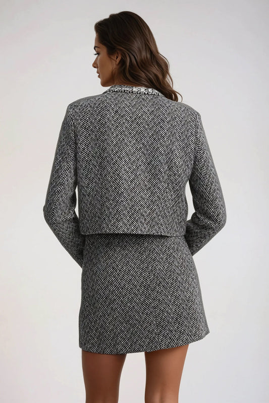 Two-Piece Set with Embellished Cropped Jacket and Mini Skirt - Gray