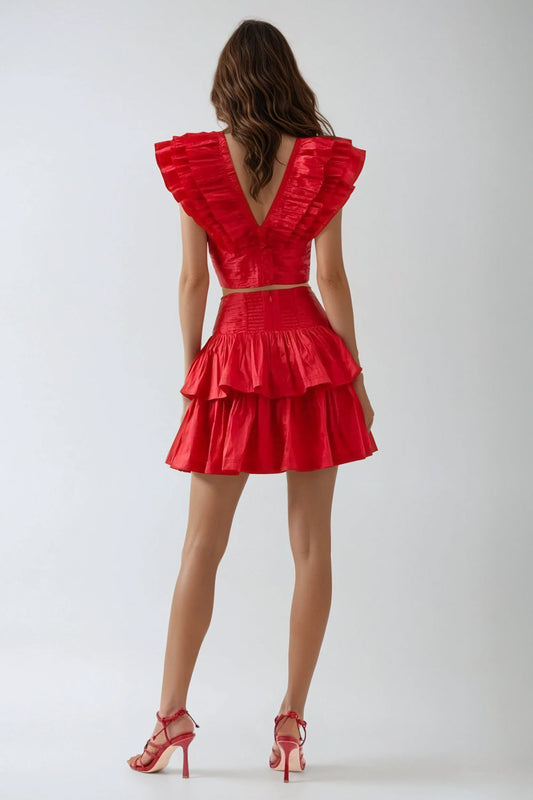 Two-Piece Set with Ruffle Crop Top and Tiered Mini Skirt - Red