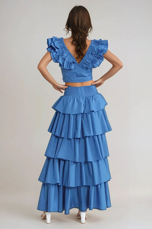 Two-Piece Set with Ruffled Top and Tiered Maxi Skirt - Blue