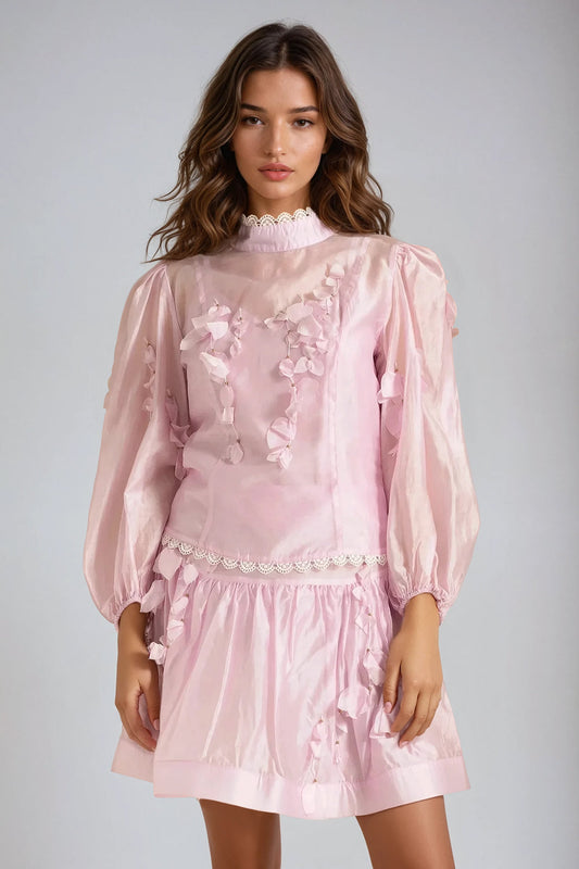 Two-Piece Set with Sheer Long-Sleeve Top and Shorts - Pink