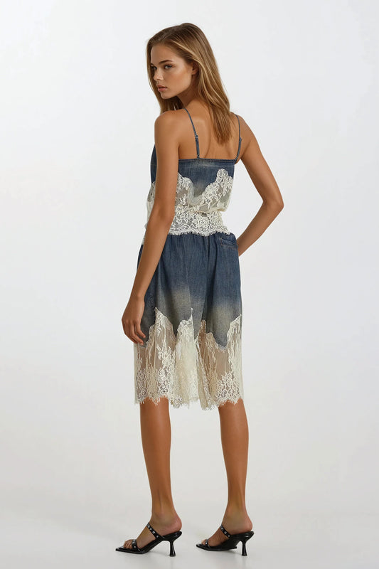 Two-Piece Set with Lace Trim Top and Shorts - Blue