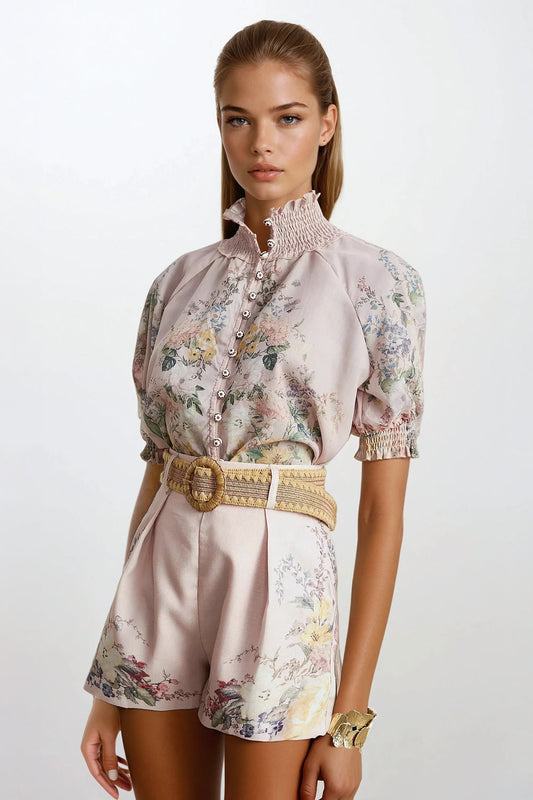 Two-Piece Set with Floral Button-Up Top and High-Waisted Shorts - White