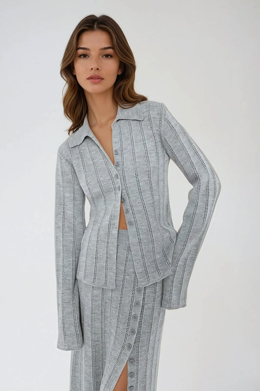 Two-Piece Set with Collared Button-Up Top and Slit Maxi Skirt - Gray