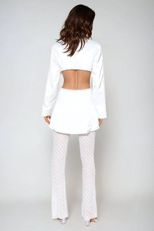 Two-Piece Set with Satin Blazer and Embellished Trousers - White