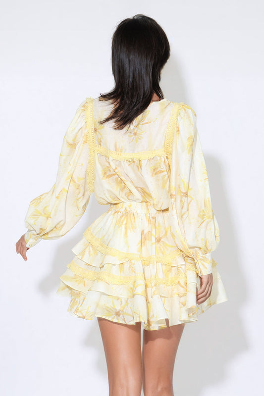Two-Piece Set with Printed Long Sleeve Top and Ruffled Skirt - Yellow