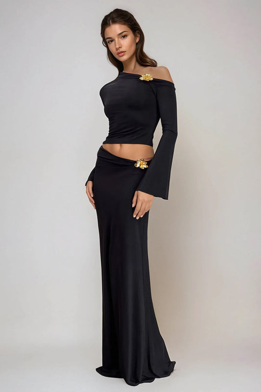 Two-Piece Set with One-Shoulder Long Sleeve Top and Maxi Skirt - Black