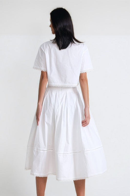 Two-Piece Set with Lace Shirt Accent and Flared Skirt - White