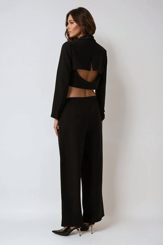 Two-Piece Set with Sequin Lapel Blazer and High-Waist Wide-Leg Trousers - Black