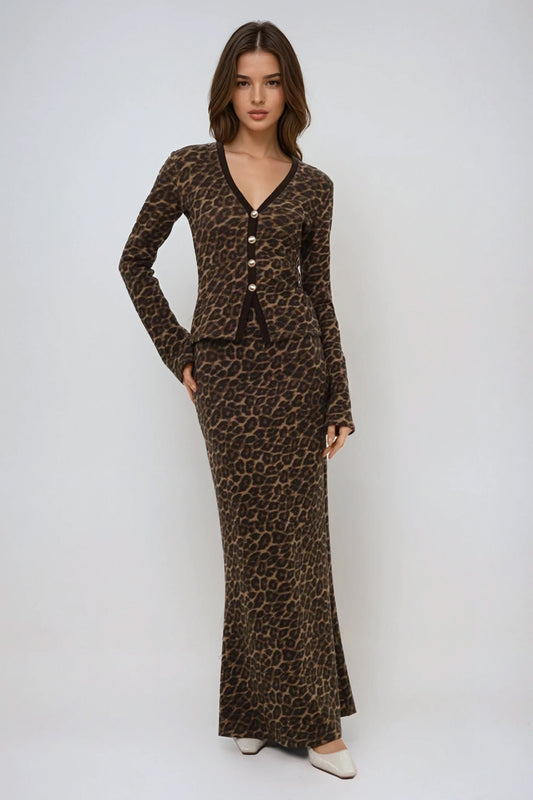 Two-Piece Set with Button-Up Top and Maxi Skirt - Brown