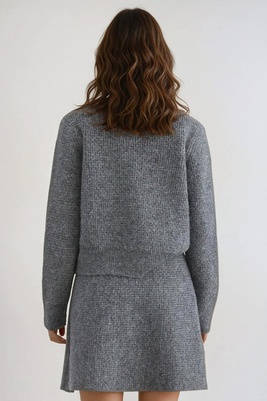Two-Piece Set with Knitted V-Neck Cardigan and A-Line Mini Skirt - Gray
