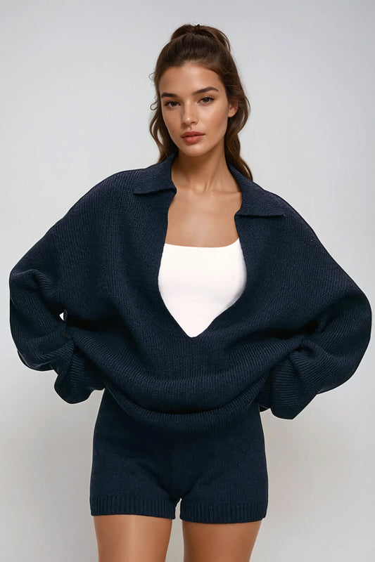 Two-Piece Set with Oversized Deep V-Neck Knit Sweater and Shorts - Blue