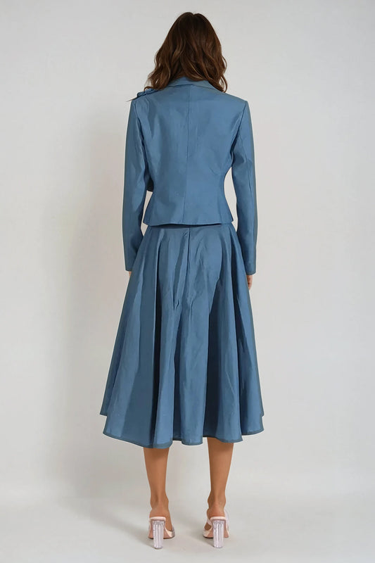 Two-Piece Set with Oversized 3D Floral Blazer and Midi Skirt - Blue