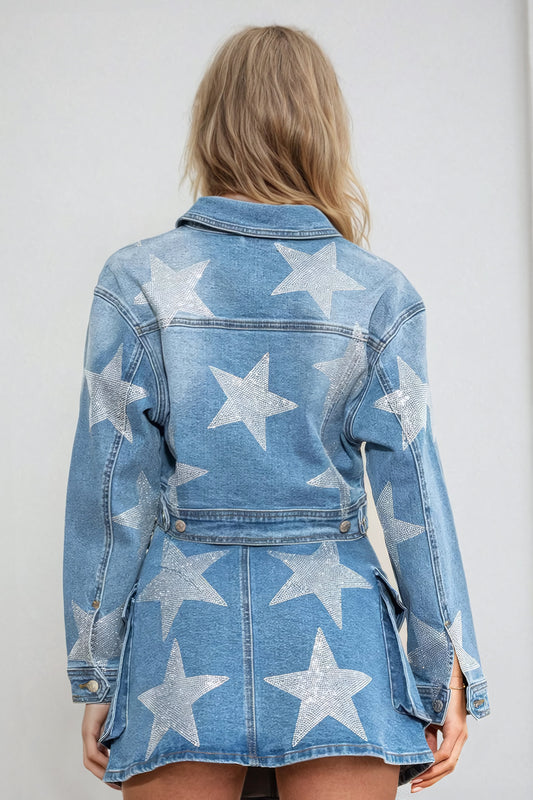 Two-Piece Set with Star Embellished Denim Jacket and Skirt - Blue