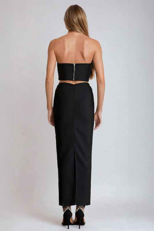 Two-Piece Set with Strapless Embellished Crop Top and Fitted Midi Skirt - Black
