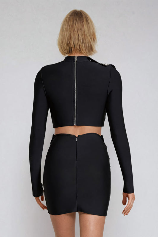 Two-Piece Set with Crystal Floral Embellished Crop Top and Skirt - Black