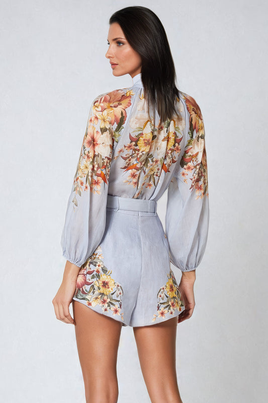 Floral Co-Ord Set with High Neck Shirt and Wide Leg Shorts - Blue